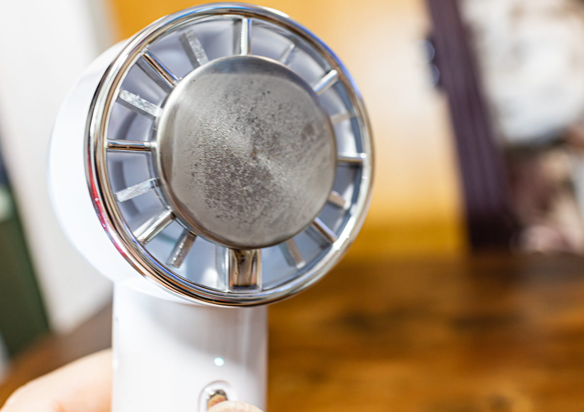 ※角度調整がしやすいネックファンなので手持ちは要らないのだが、風量を見せる演出上、手持ちしています