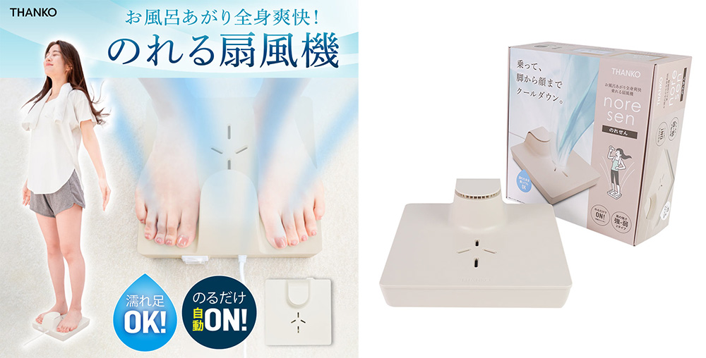 こちらは「お風呂上がりの火照った身体を一気に冷やしたい」というニーズから生まれた新スタイルの扇風機。体重計のようなデザインで、乗ると下から風が噴き出し全身をくまなく冷やしてくれます。会場で乗ってみたところなかなかの風量で、同行した編集さんのロングスカートがパンパンに膨れていました。