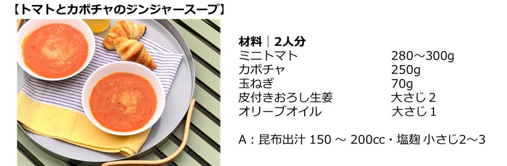 なお、料理家・井澤由美子さん考案の「たっぷりショウガオールレシピ」もう一品『トマトとカボチャのジンジャースープ』のレシピはこちらだ。身体の内側から温めてくれる生姜と食物繊維たっぷりのトマトとカボチャ、腸活効果のあるオリーブオイルを使用。塩麹や玉ねぎと合わせることで、さらに温活・腸活の効果が高められるという。