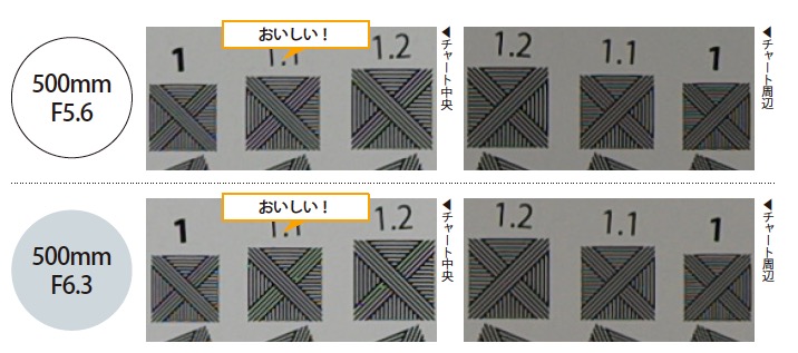 そして、今回はじめて行った超望遠レンズ「SIGMA 500mm F5.6 DG DN OS | Sports」の解像力チャートの結果は開放付近は上に掲載したとおりになっています。絞り開放のF5.6から基準となるチャートである1.1を画面中央はもちろん、周辺部分でも十分以上に解像し、それどころかさらに小さな1のチャートも多くの部分を解像しています。中央部分のチャートの比べて、周辺部分のチャートが少し暗いのは周辺光量落ちの影響でしょう。素晴らしい結果です。