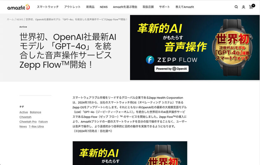 「世界初、OpenAI社最新AIモデル 「GPT-4o」を統合した音声操作サービスZepp Flow開始!」(https://www.amazfit.jp/blogs/news/zeppflow)のニュース。