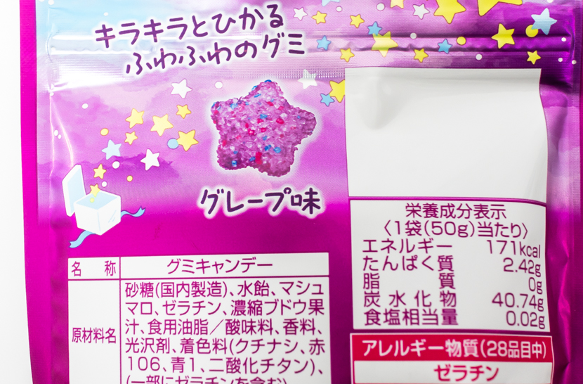 パッと見た目はキラキラコーティングでゴリゴリしてそうな『キラふわ グレープ』(50g・オープン価格・2024年9月23日発売)だけど、グミの外側は「シャリッ」で、中は「ふわふわ」という宇宙感のある食感。かわいいし、きらびやかだし、色がパープルという派手さがポイント。