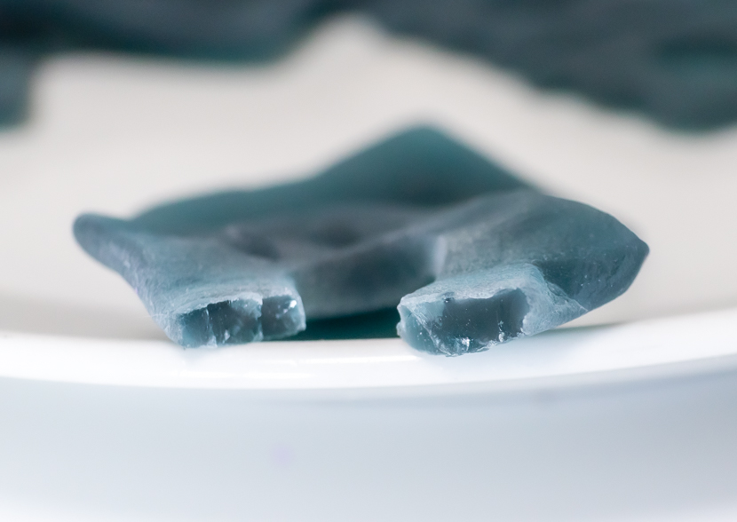 おとぼけ感満点のキャラクターなのに、噛んでみるとやっぱりハード。してやられました。甘すぎなくてしっかり酸味もあるソーダ味がちょうどいい。見ようによっては大人っぽいカラー。断面を見ると、さながら和菓子の「琥珀糖(こはくとう)」のようにも見えてきました。きれい……。