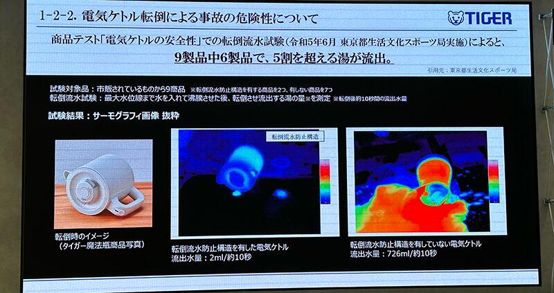 しかし安全対策がされていない製品は意外に多く、令和5年に東京都生活文化スポーツ局が実地した転倒流水試験では、9製品中6製品で「半分以上のお湯がこぼれた」という結果に。このままでは大きな事故や火傷がいつまでも防げないということで、今回の新基準につながったのです。